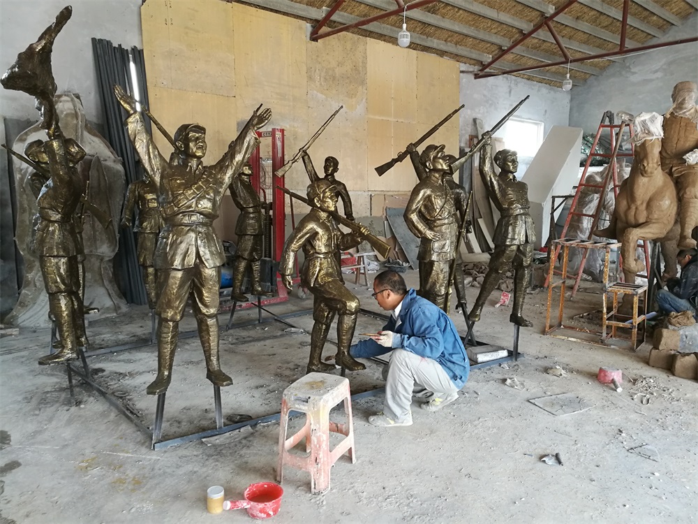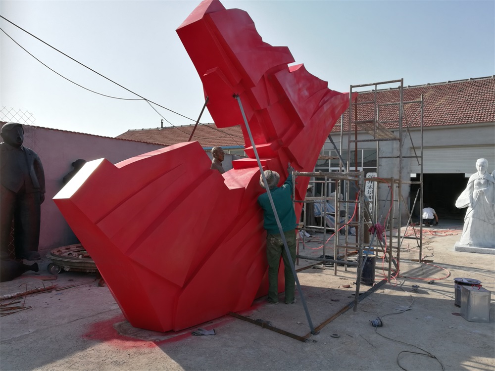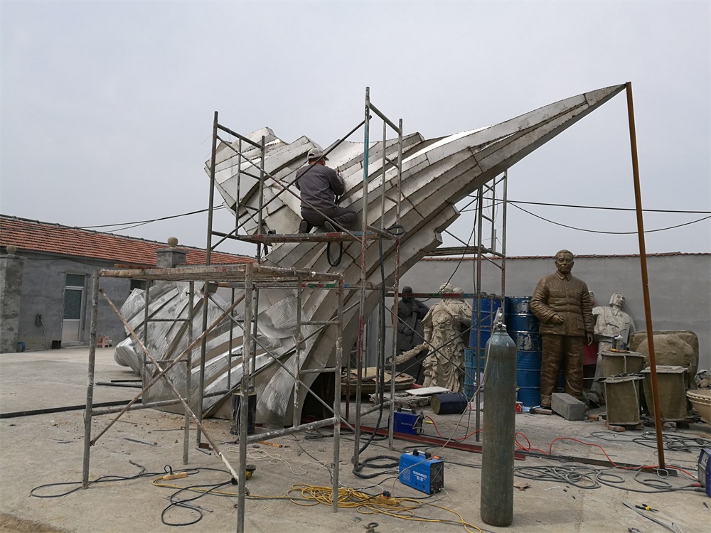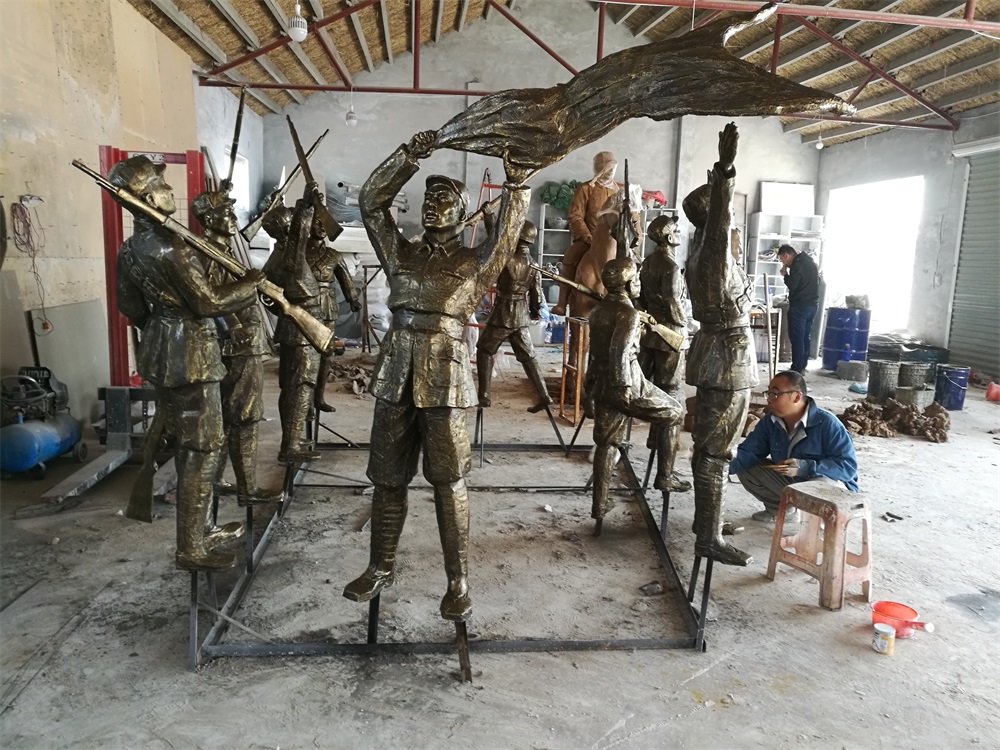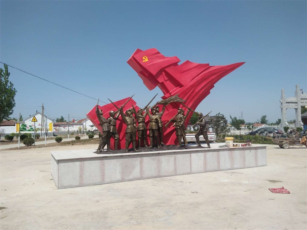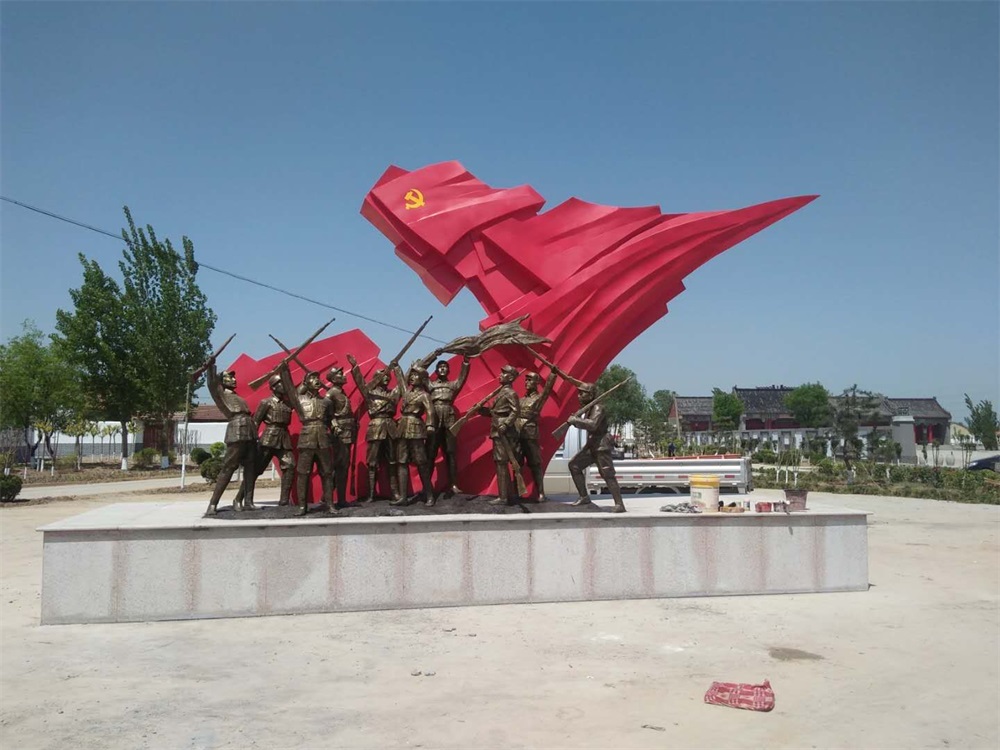 雕塑說明:紅旗雕塑采用不銹鋼鍛造工藝做型,高4米,長(zhǎng)8米。人物群雕共10個(gè)人物,采用玻璃鋼工藝制作。