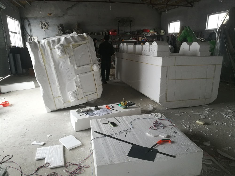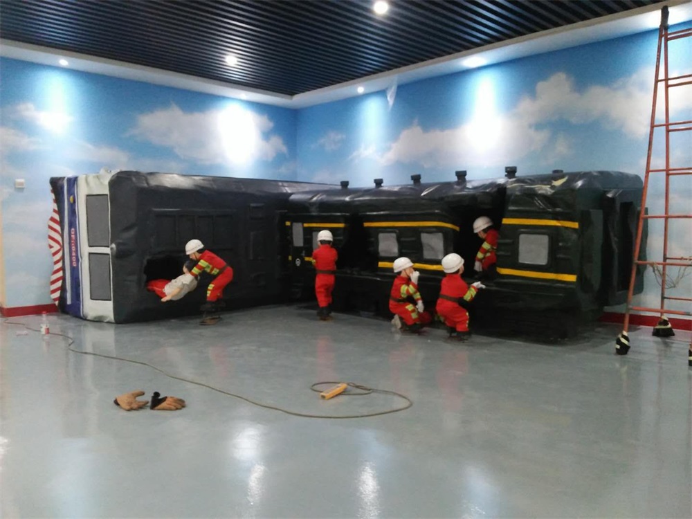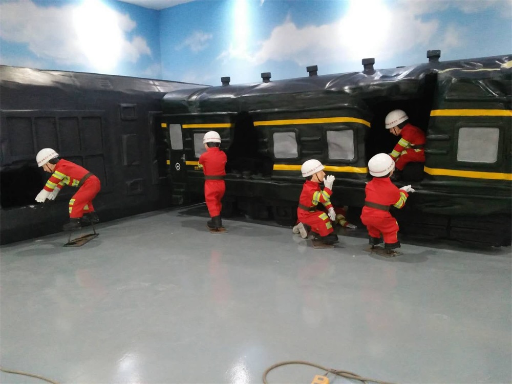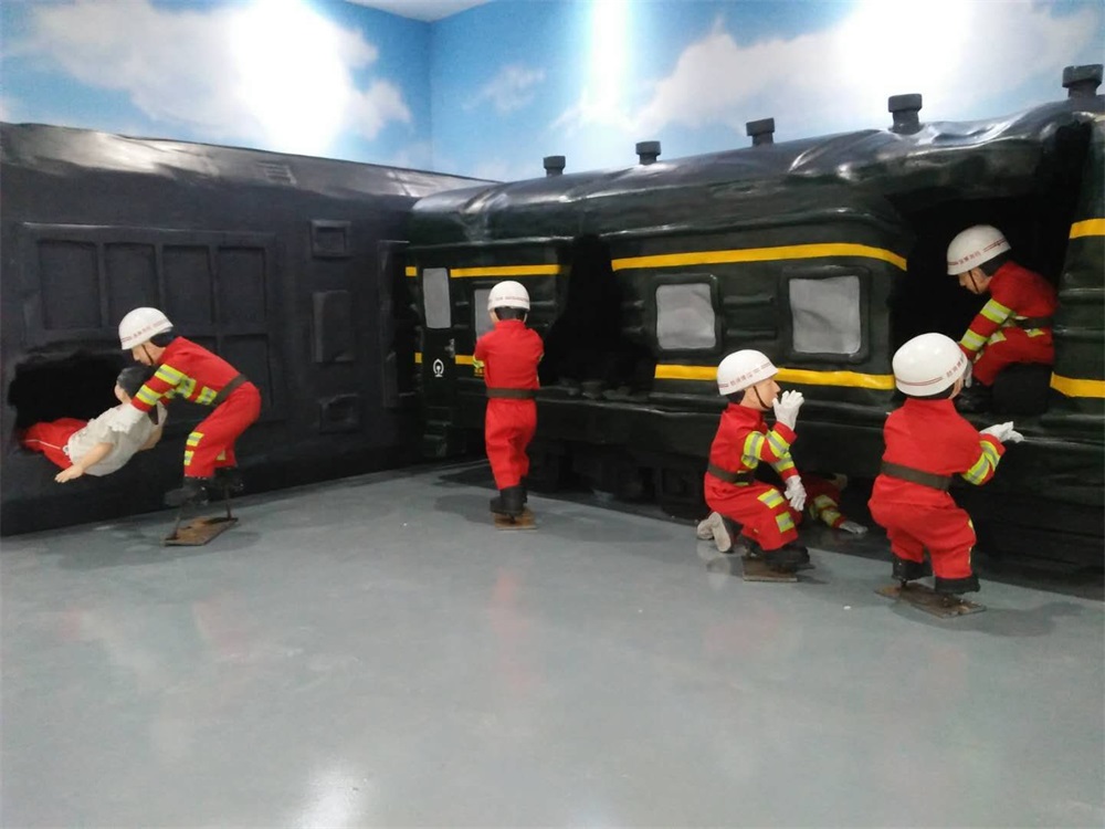 雕塑說明:雕塑整體場景以發(fā)生在淄博市境內(nèi)的一場火車碰撞事故救援現(xiàn)場為題材?;疖嚹P筒捎门菽袼芄に囍谱鳎砻娌世L。消防人物雕塑采用玻璃鋼雕塑工藝制作。
