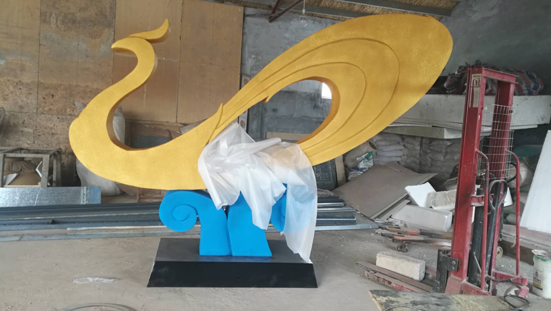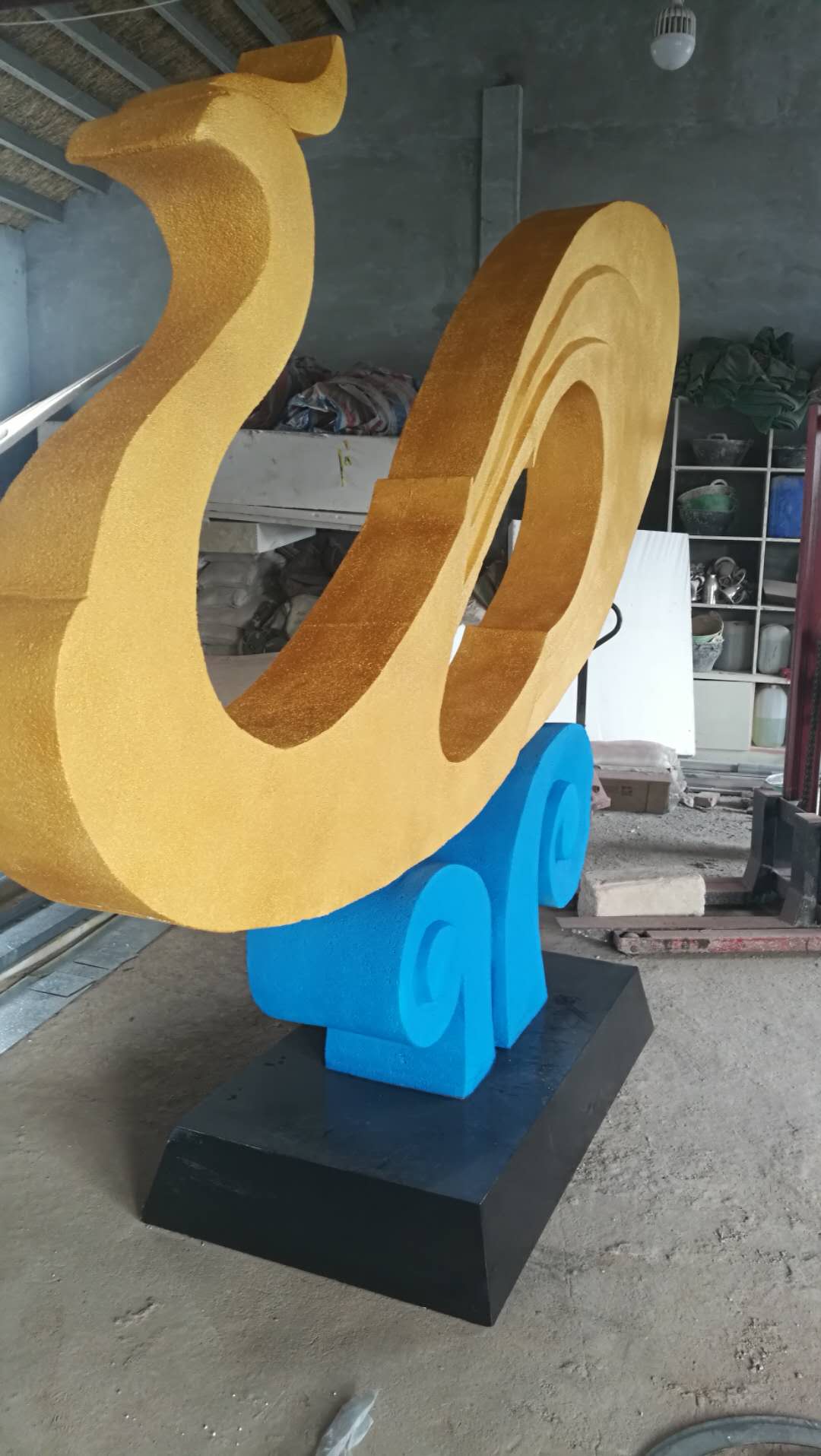 雕塑說明:本雕塑根據(jù)碧桂園的logo創(chuàng)作設(shè)計(jì)。雕塑高2.7米,長3.6米,上面孔雀表面沙金效果,浪花湖藍(lán)色,底座黑色。雕塑材質(zhì)為泡沫,表面仿砂巖效果,彩噴。