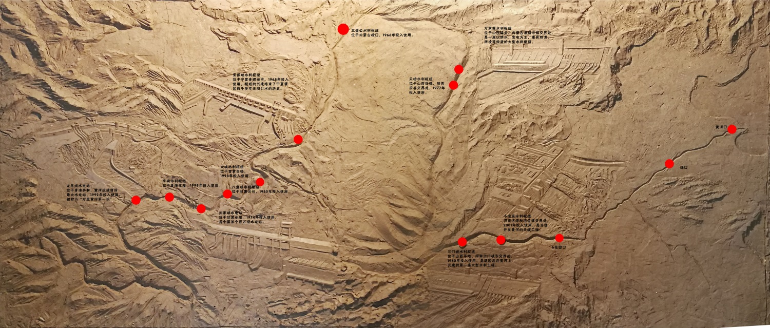 小浪底上游河段:按照地理位置將三門峽、龍羊峽、小浪底、萬家寨、劉家峽、青銅峽點(diǎn)綴其上(浮雕加簡介)。其余水利樞紐僅標(biāo)注位置以及投入使用時間。