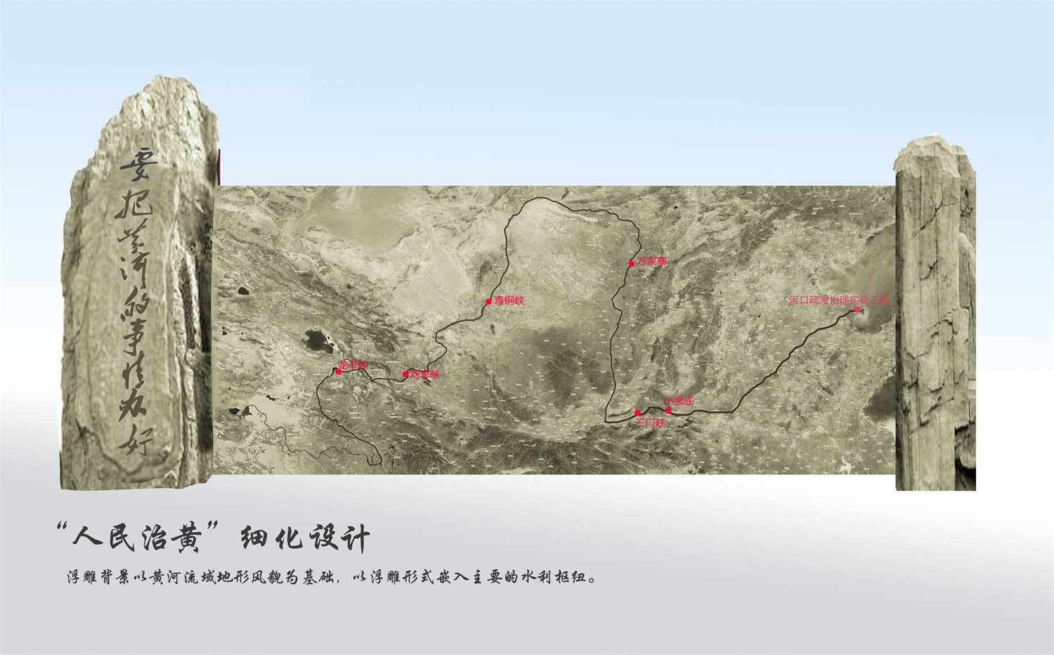 人民治黃浮雕主體按照黃河流域地貌起伏特征,展現(xiàn)黃河河道全貌,。